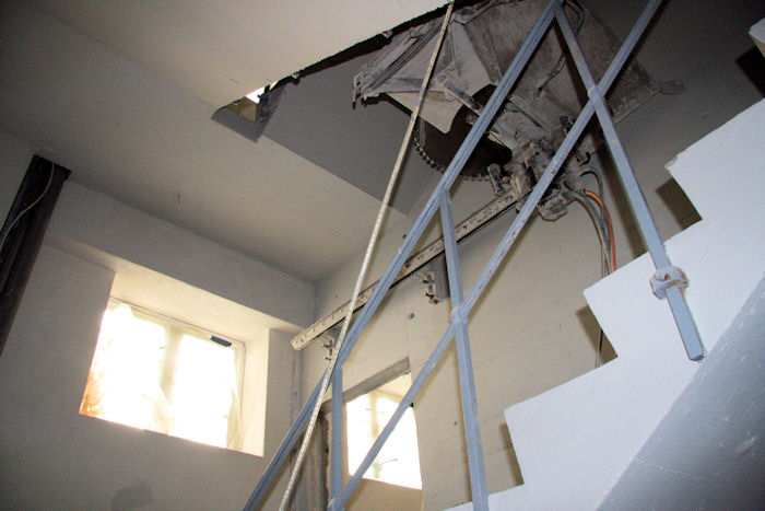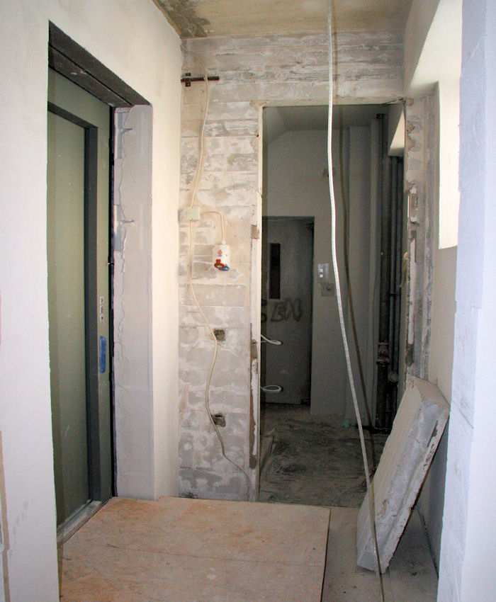 | 06.10.2009 - 9:14 Uhr - Kappeln/Schlei: PK-Speicher im Nordhafen 3. Obergeschoss - Treppenhaus Die Öffnung vom Vorraum des neuen Fahrstuhls zum Treppenhaus wurde bereits etwas höher aufgesägt. Foto: Eckhard Schmidt - Kappeln - (C) 2009 |