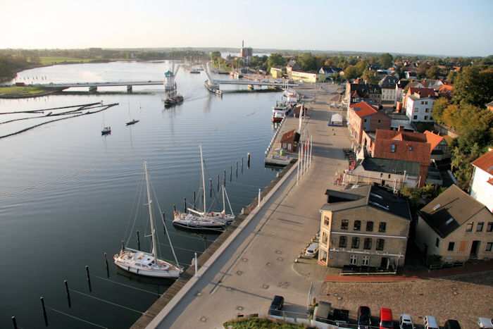 | 09.10.2009 - 8:50 Uhr - Kappeln/Schlei: PK-Speicher im Nordhafen 10. Obergeschoss - Südseite - Ausblick Schleibrücke Brückenöffnung 8:45 Uhr Die Klappen werden wieder geschlossen. Foto: Eckhard Schmidt - Kappeln - (C) 2009 |