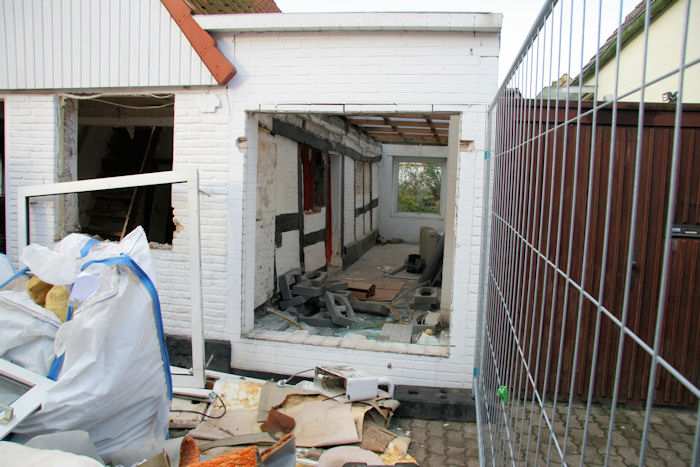 | 13.10.2009 - 9:35 Uhr - Kappeln/Schlei: Anwesen Querstraße Nr. 7 Abbrucharbeiten Das bestehende Gebäude ist auf beiden Seiten durch Anbauten erweitert. Diese Räumlichkeiten wurden früher für Ausstellungen genutzt. Foto: Eckhard Schmidt - Kappeln - (C) 2009 |
