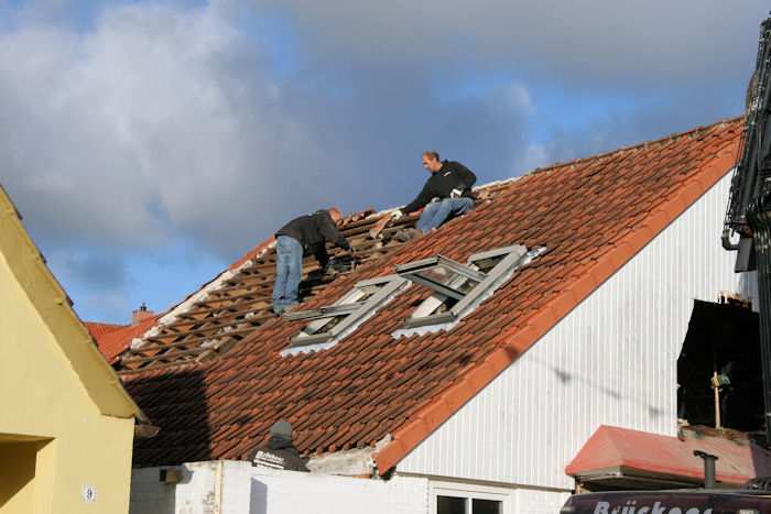 | 13.10.2009 - 9:39 Uhr - Kappeln/Schlei: Anwesen Querstraße Nr. 7 Abbrucharbeiten Zwei Mitarbeiter der Firma Brückner sind gerade dabei das Dach des Gebäudes abzudecken. Foto: Eckhard Schmidt - Kappeln - (C) 2009 |