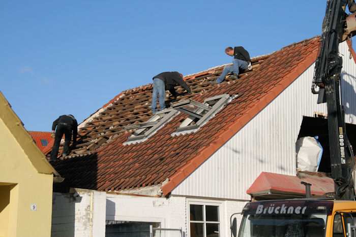 | 13.10.2009 - 9:48 Uhr - Kappeln/Schlei: Anwesen Querstraße Nr. 7 Abbrucharbeiten Drei Mitarbeiter der Firma Brückner sind gerade dabei das Dach des Gebäudes abzudecken. Foto: Eckhard Schmidt - Kappeln - (C) 2009 |