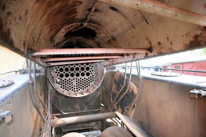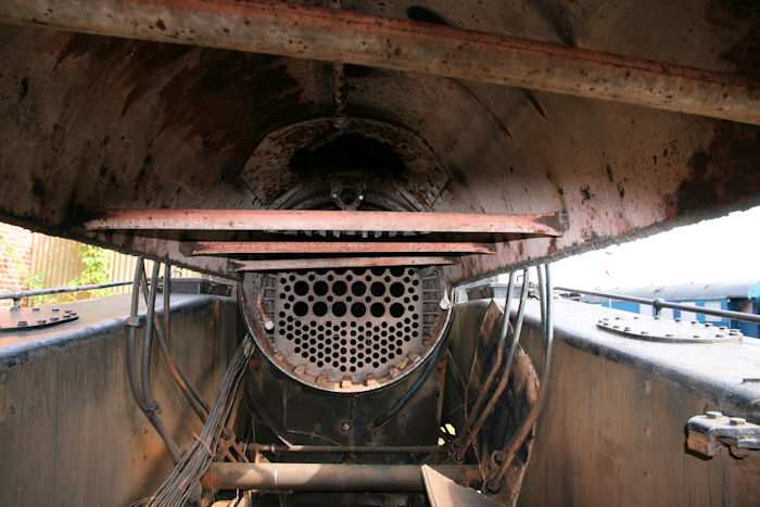 | 20.05.2010 - 9:56 Uhr - Kappeln/Schlei: Angelner Dampfeisenbahn Dampflok S1916 Kesselreparatur Blick durch die vordere Rauchkammerrohrwand in den Kessel. Im Hintergrund ist die hintere Rauchkammerrohrwand mit der dahinter liegenden Feuerbüchse zu erkennen. Foto: Eckhard Schmidt - Kappeln - (C) 2010 |