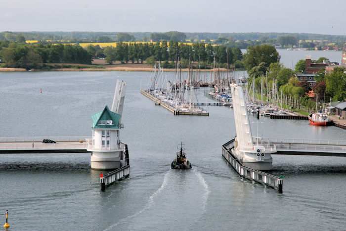 | 27.05.2010 - 8:48 Uhr - Kappeln/Schlei: PK-Speicher im Nordhafen 10. Obergeschoss - Südseite - Aussicht Brückenöffnung 8:45 Uhr Der Schlepper ANTON der Wasserbaufirma Ostseedienst passiert die Brücke in Richtung Süden. Foto: Eckhard Schmidt - Kappeln - (C) 2010 |
