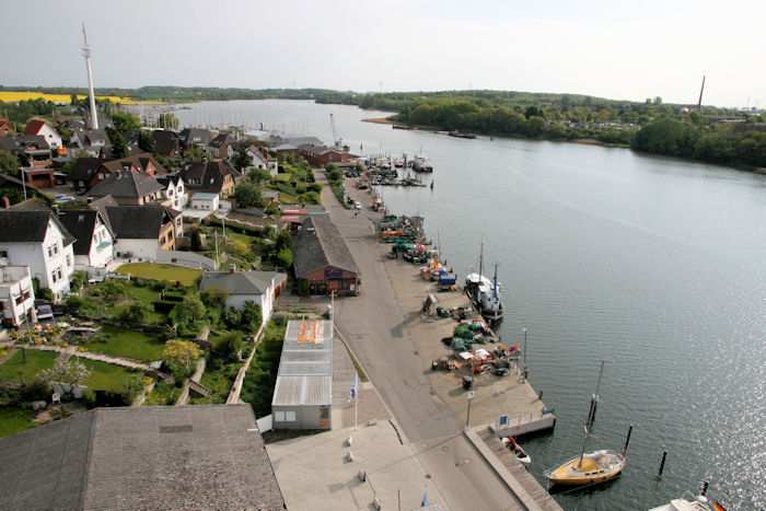 | 27.05.2010 - 8:49 Uhr - Kappeln/Schlei: PK-Speicher im Nordhafen 10. Obergeschoss - Nordseite - Aussicht Fischereihafen Foto: Eckhard Schmidt - Kappeln - (C) 2010 |