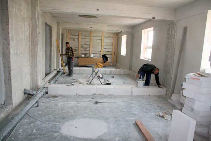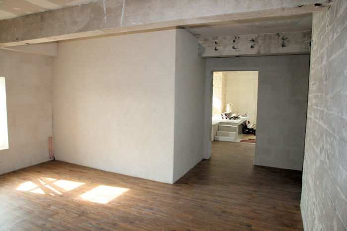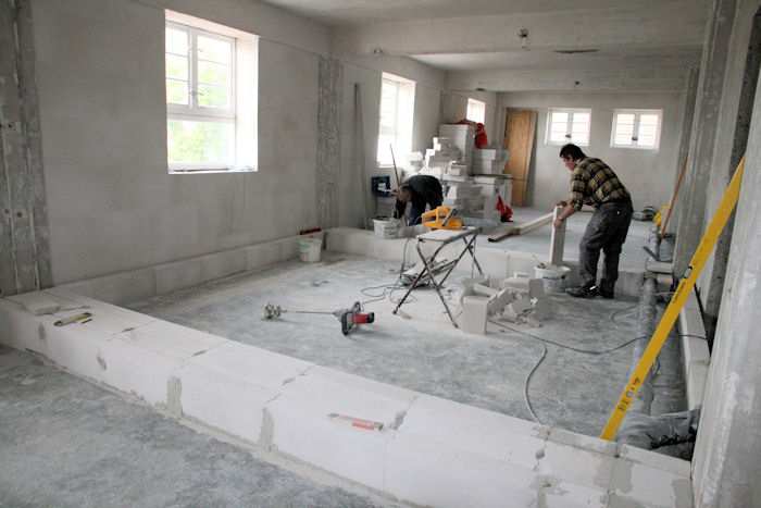| 27.05.2010 - 8:56 Uhr - Kappeln/Schlei: PK-Speicher im Nordhafen 2. Obergeschoss - Südseite Vor den Zellen 1 bis 4 entstehen drei weitere Zimmer. Es werden gerade die Ytong-Steine für die Trennwände und die Anhebung des Fußbodens gesetzt. Osten Norden <--- + ---> Süden Foto: Eckhard Schmidt - Kappeln - (C) 2010 |