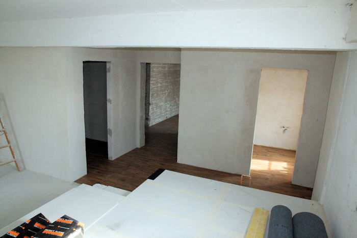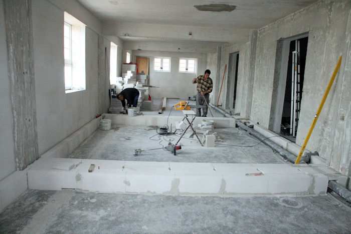| 27.05.2010 - 8:56 Uhr - Kappeln/Schlei: PK-Speicher im Nordhafen 2. Obergeschoss - Südseite Vor den Zellen 4 bis 1 entstehen drei weitere Zimmer. Es werden gerade die Ytong-Steine für die Trennwände und die Anhebung des Fußbodens gesetzt. Westen Süden <--- + ---> Norden Foto: Eckhard Schmidt - Kappeln - (C) 2010 |