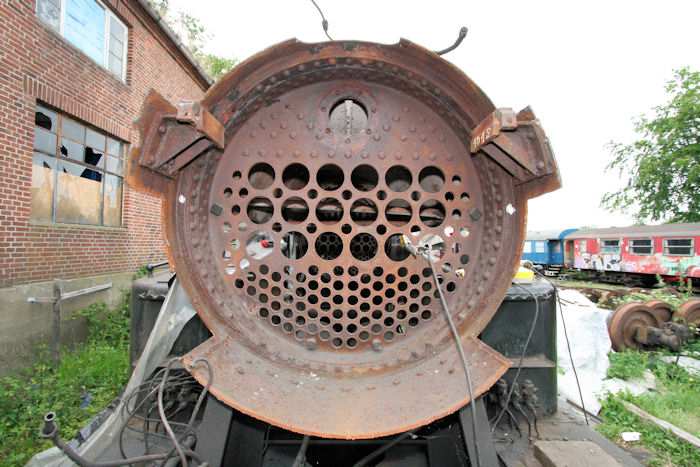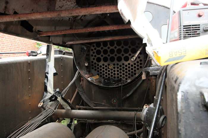 | 06.07.2010 - 9:22 Uhr - Kappeln/Schlei: Angelner Dampfeisenbahn Dampflok S1916 - Kesselreparatur Vordere Rauchkammerrohrwand Hier wurde bereits Material per Schweißen auf das Stahlblech im unteren Bereich des Kessels aufgetragen und glatt geschliffen. Die Arbeiten müssen später noch vom TÜV abgenommen werden. Foto: Eckhard Schmidt - Kappeln - (C) 2010 |