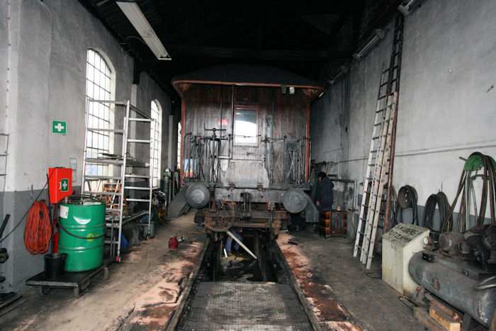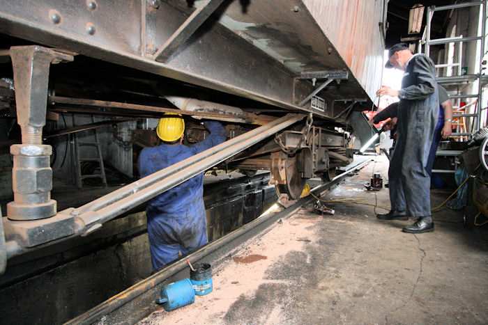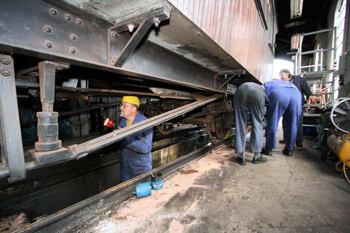 | 06.07.2010 - 9:24 Uhr - Kappeln/Schlei: Angelner Dampfeisenbahn Wagen FSF04 - Inspektions- und Wartungsarbeiten Der Wagen FSF04 wurde in den Lokschuppen geschoben, um von der Grube aus die Inspektionsarbeiten an der Unterseite des Wagens ausführen zu können. Die Arbeiten werden von Mitgliedern des Vereins ausgeführt. Foto: Eckhard Schmidt - Kappeln - (C) 2010 |