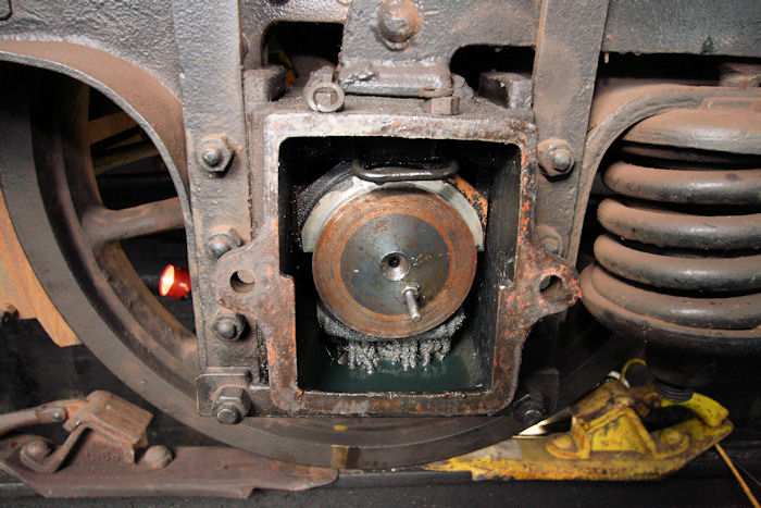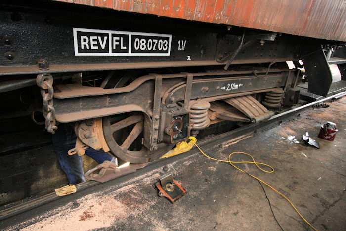 | 06.07.2010 - 9:27 Uhr - Kappeln/Schlei: Angelner Dampfeisenbahn Wagen FSF04 - Inspektions- und Wartungsarbeiten Alle Achslagerdeckel müssen für die Inspektion aufgeschraubt werden. Foto: Eckhard Schmidt - Kappeln - (C) 2010 |