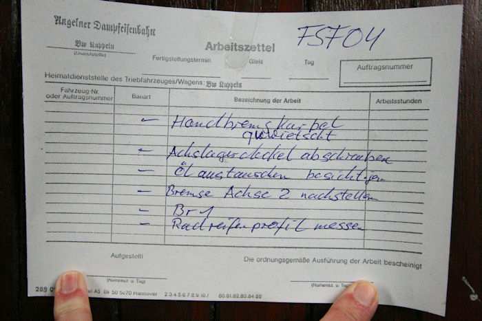 | 06.07.2010 - 9:29 Uhr - Kappeln/Schlei: Angelner Dampfeisenbahn Wagen FSF04 - Inspektions- und Wartungsarbeiten Seitlich am Wagen hängt ein Arbeitszettel mit den auszuführenden Arbeiten. Foto: Eckhard Schmidt - Kappeln - (C) 2010 |