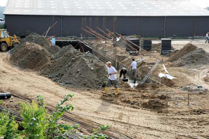| 04.08.2010 - 8:46 Uhr - Kappeln/Schlei: Wassermühlenstraße / Ziegeleiweg Neubau eines Penny Marktgebäudes Der Boden zwischen den Fundamenten der Seitenwände wird mit Kies aufgefüllt und mit Hilfe eines Rüttlers verdichtet. Westen Süden <--- + ---> Norden Foto: Eckhard Schmidt - Kappeln - (C) 2010 |