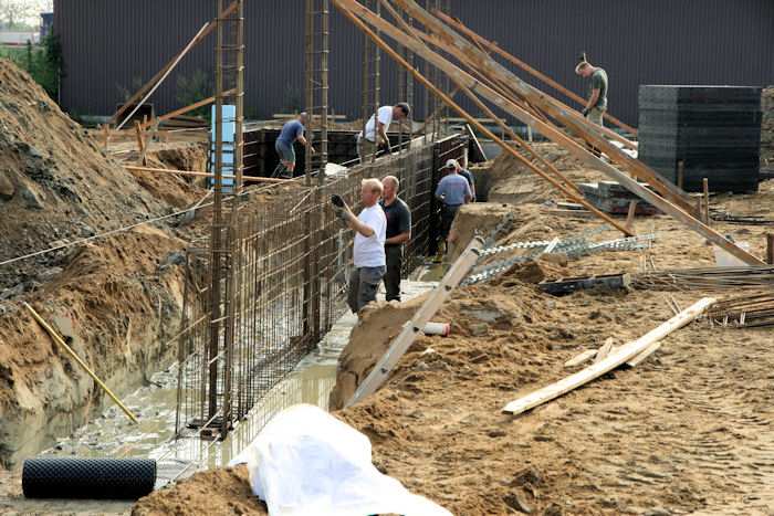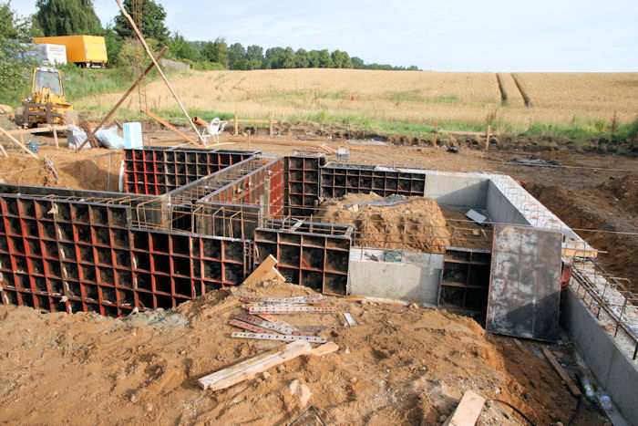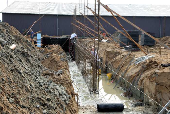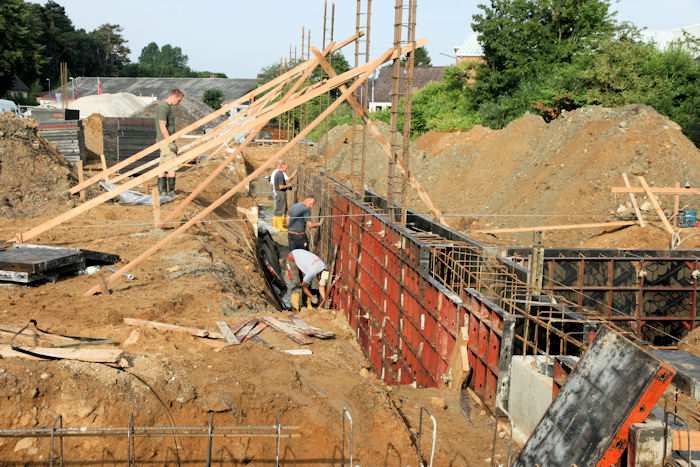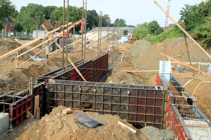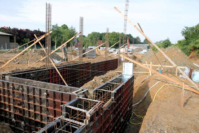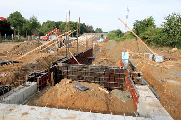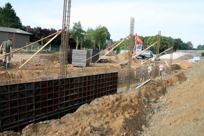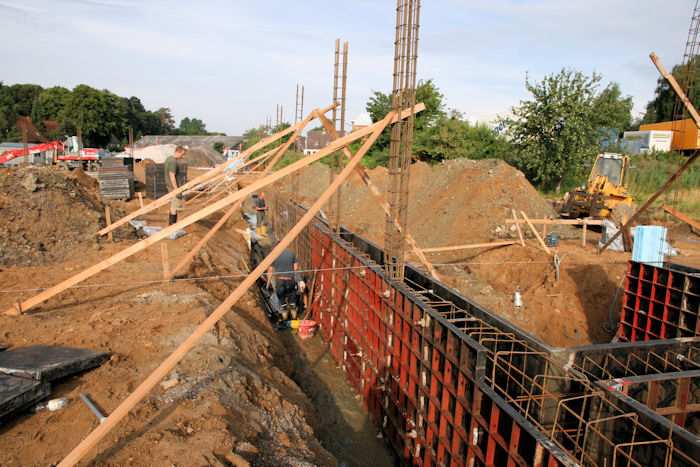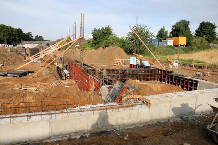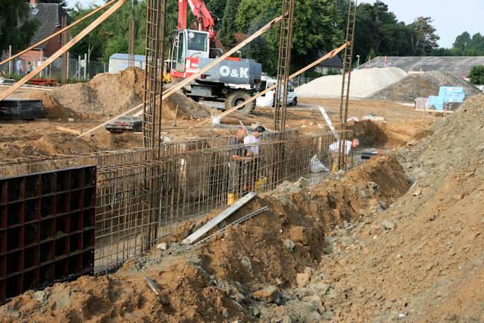 | 04.08.2010 - 8:43 Uhr - Kappeln/Schlei: Wassermühlenstraße / Ziegeleiweg Neubau eines Penny Marktgebäudes Fundament für die Nordwand Aufstellung von Schalwänden und Ausführung von Bewehrungsarbeiten Foto: Eckhard Schmidt - Kappeln - (C) 2010 |