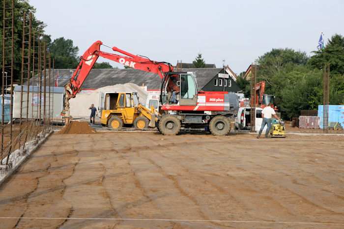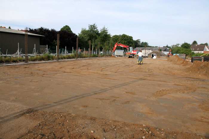| 04.08.2010 - 8:42 Uhr - Kappeln/Schlei: Wassermühlenstraße / Ziegeleiweg Neubau eines Penny Marktgebäudes Vor der Laderampe zum Entladen der LKWs entsteht eine abschüssige Rampe. Westen Süden <--- + ---> Norden Foto: Eckhard Schmidt - Kappeln - (C) 2010 |