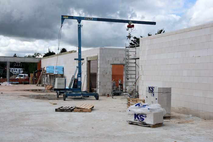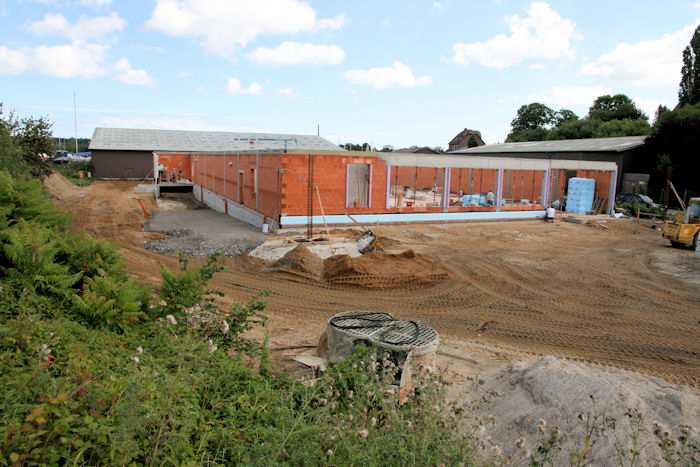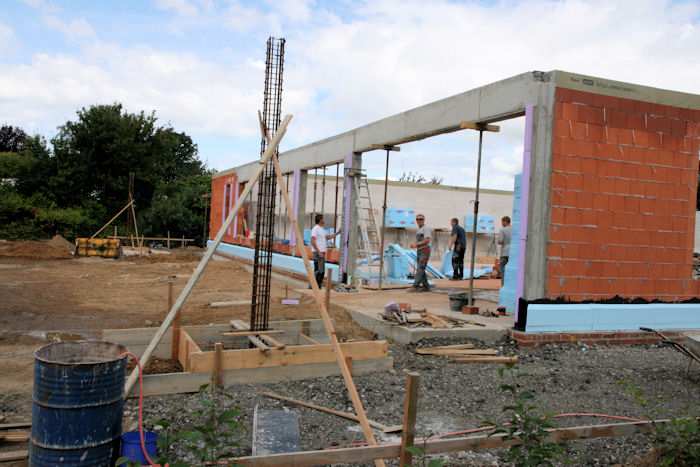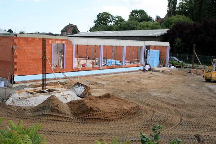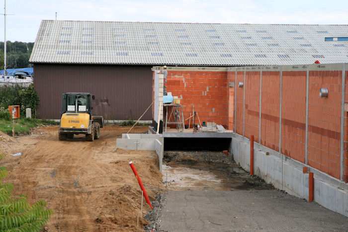 | 01.09.2010 - 13:30 Uhr - Kappeln/Schlei: Wassermühlenstraße / Ziegeleiweg Neubau eines Penny Marktgebäudes Nordseite Die nördliche Trennwand auf der Laderampe hat fast die Sollhöhe erreicht. Foto: Eckhard Schmidt - Kappeln - (C) 2010 |