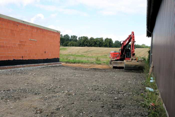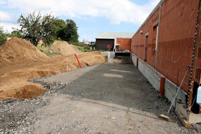 | 01.09.2010 - 13:38 Uhr - Kappeln/Schlei: Wassermühlenstraße / Ziegeleiweg Neubau eines Penny Marktgebäudes Nordseite Blick von der Laderampe in Richtung Westen. Vor hier aus ist die abschüssige Rampe gut erkennen. Im Bereich der großen Betonwinkel verläuft die Zufahrt vor der Laderampe fast waagerecht. Foto: Eckhard Schmidt - Kappeln - (C) 2010 |