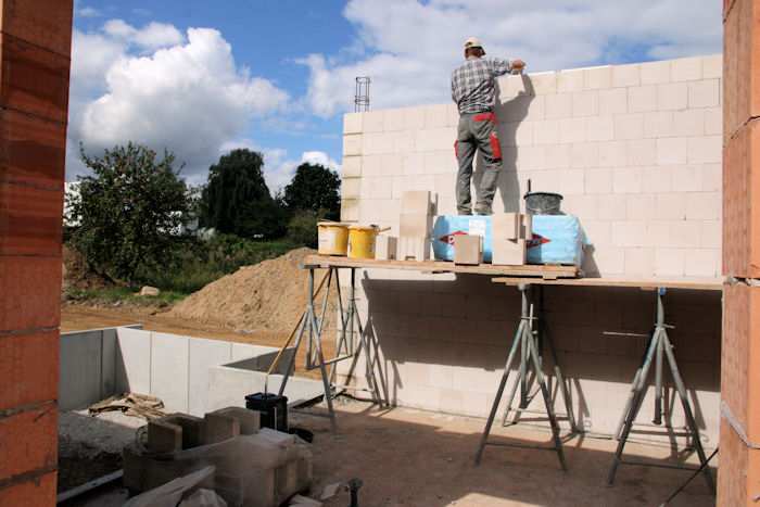 | 01.09.2010 - 13:34 Uhr - Kappeln/Schlei: Wassermühlenstraße / Ziegeleiweg Neubau eines Penny Marktgebäudes Innenbereich Die Kalksandsteine der breiten Trennwand haben ihre Sollhöhe erreicht. Oben auf der Wand fehlen noch einige Schalungselemente für den Betonbalken. Foto: Eckhard Schmidt - Kappeln - (C) 2010 |