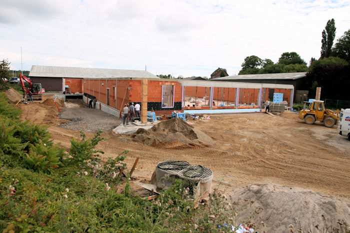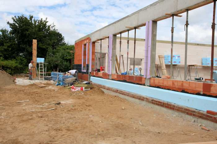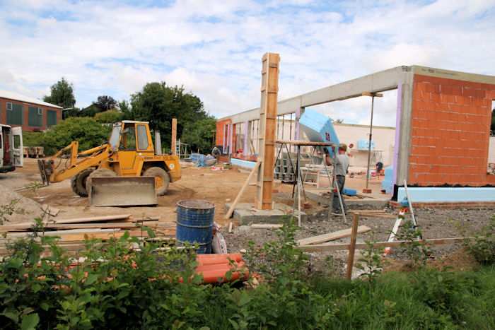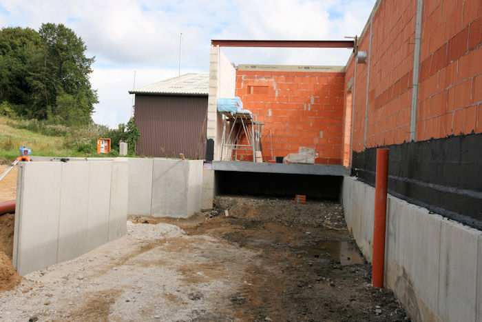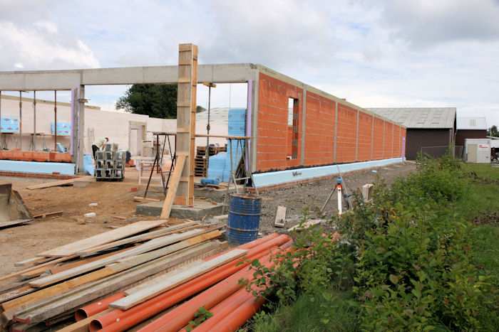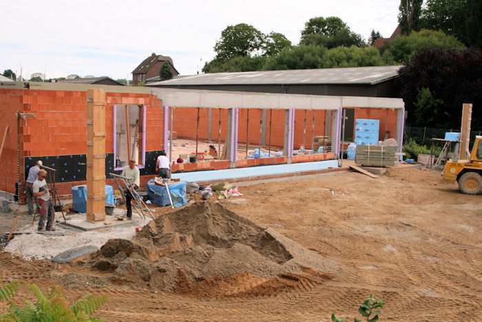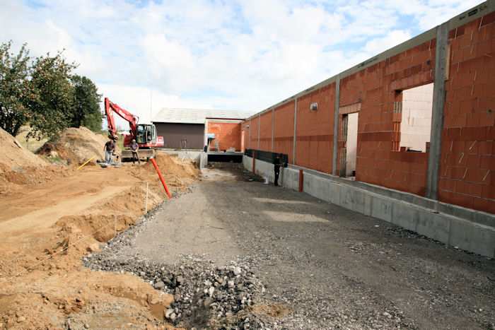 | 02.09.2010 - 13:34 Uhr - Kappeln/Schlei: Wassermühlenstraße / Ziegeleiweg Neubau eines Penny Marktgebäudes Nordseite - Laderampe Die nördliche Seitenwand aus Kalksandsteine ist fertig aufgemauert. Foto: Eckhard Schmidt - Kappeln - (C) 2010 |