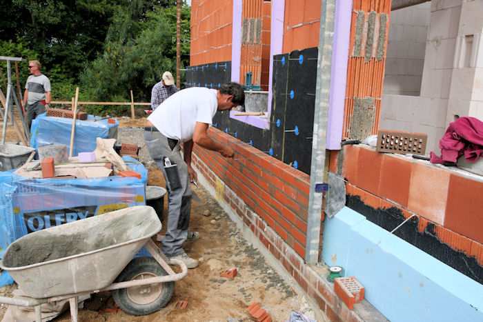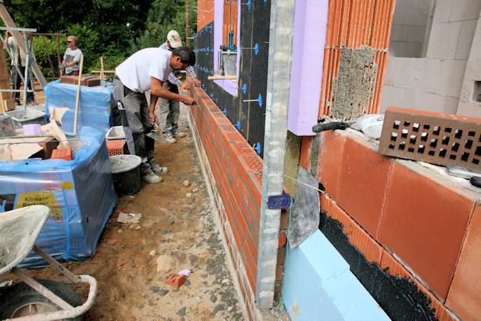 | 02.09.2010 - 13:27 Uhr - Kappeln/Schlei: Wassermühlenstraße / Ziegeleiweg Neubau eines Penny Marktgebäudes Westseite - Außenschale Rechts im Bild ist ein Klinker vom Typ Patina glatt zu erkennen. Bei der Außenschale werden gerade senkrechte Fugen für die Belüftung des Raumes hinter der Außenschale frei gekratzt. Foto: Eckhard Schmidt - Kappeln - (C) 2010 |