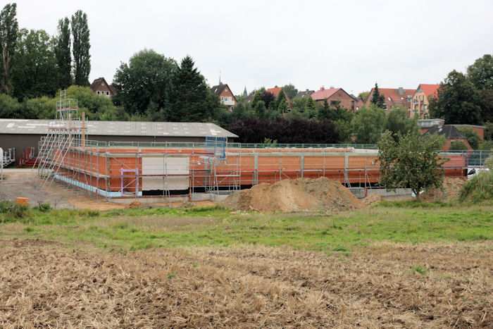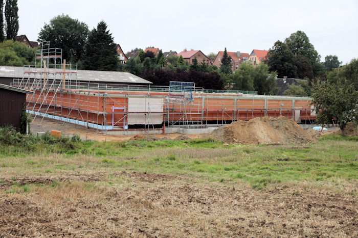| 08.09.2010 - 9:11 Uhr - Kappeln/Schlei: Wassermühlenstraße / Ziegeleiweg Neubau eines Penny Marktgebäudes Ostseite / Nordseite Ansicht des Markgebäudes vom Acker nördlich vom Baugelände. Heute ist es ruhig auf der Baustelle. Ich mache nur einen kurzen Rundgang. Foto: Eckhard Schmidt - Kappeln - (C) 2010 |