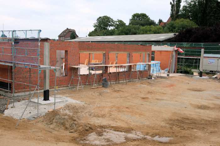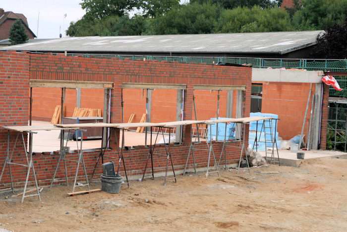 | 08.09.2010 - 9:09 Uhr - Kappeln/Schlei: Wassermühlenstraße / Ziegeleiweg Neubau eines Penny Marktgebäudes Südseite / Ostseite Bei der Südwand wird das östliche Drittel verblendet. Die Maurer machen gerade Frühstückspause. Foto: Eckhard Schmidt - Kappeln - (C) 2010 |