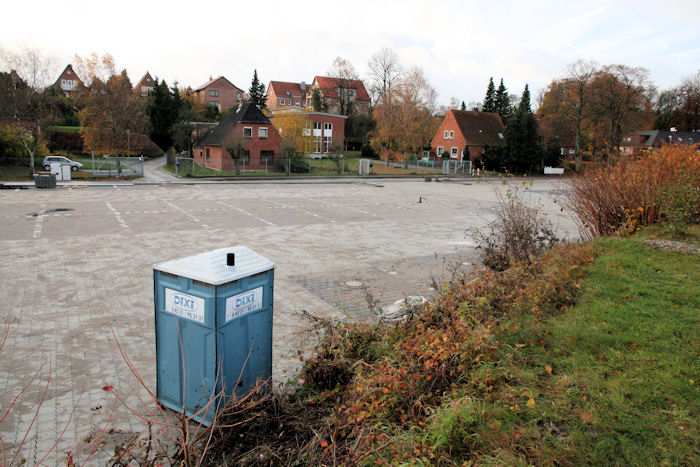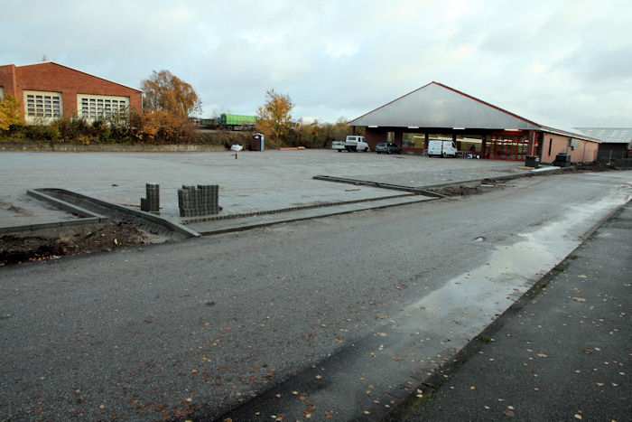 | 05.11.2010 - 8:31 Uhr - Kappeln/Schlei: Wassermühlenstraße / Ziegeleiweg Neubau eines Penny Marktgebäudes Abschüssige Rampe und Parkplatz Ansicht von Westen Foto: Eckhard Schmidt - Kappeln - (C) 2010 |