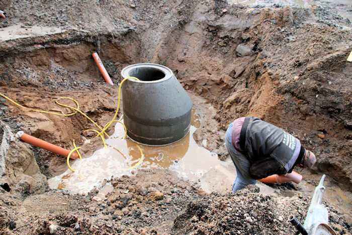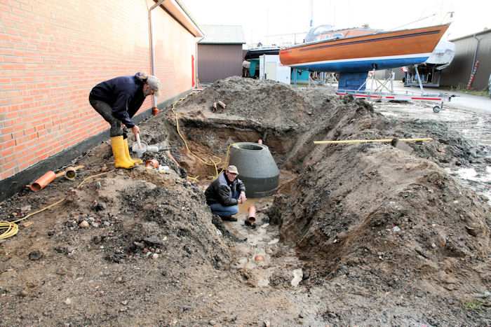 | 05.11.2010 - 8:43 Uhr - Kappeln/Schlei: Wassermühlenstraße / Ziegeleiweg Neubau eines Penny Marktgebäudes Südseite Jetzt müssen noch die drei Rohre des Schachtes mit den Abwasserrohren des Gebäudes verbunden werden. Foto: Eckhard Schmidt - Kappeln - (C) 2010 |