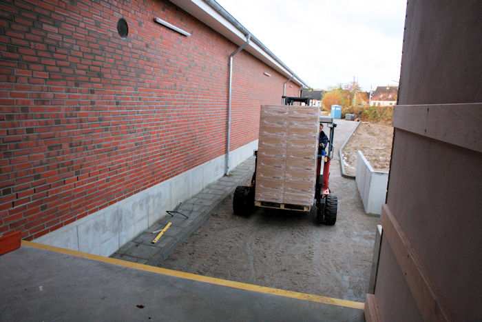 | 05.11.2010 - 8:56 Uhr - Kappeln/Schlei: Wassermühlenstraße / Ziegeleiweg Neubau eines Penny Marktgebäudes Nordseite Der Gabelstapler des LKW bringt die Paletten mit den Deckenplatten zur Laderampe. Foto: Eckhard Schmidt - Kappeln - (C) 2010 |