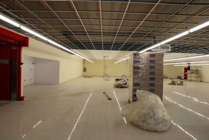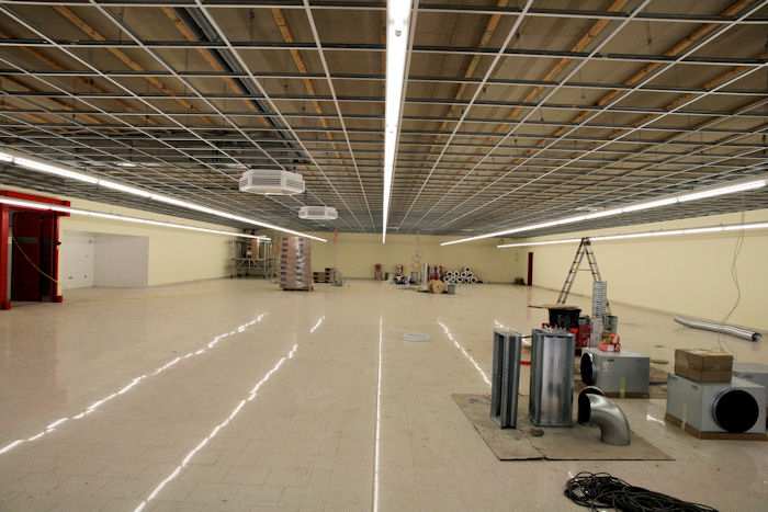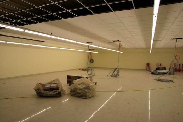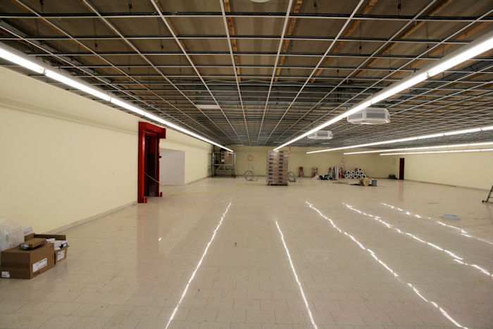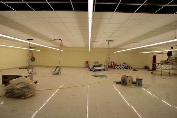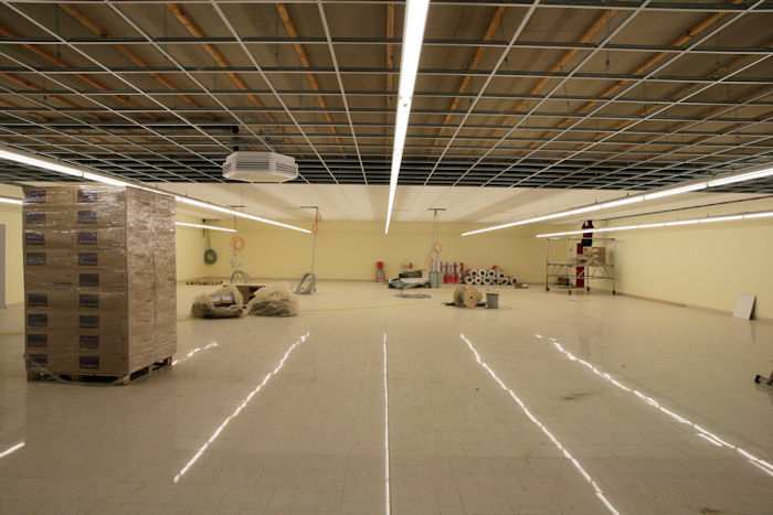| 05.11.2010 - 8:57 Uhr - Kappeln/Schlei: Wassermühlenstraße / Ziegeleiweg Neubau eines Penny Marktgebäudes Verkaufsbereich - Nordseite Ansicht von Westen In der Nordostecke des Raumes werden gerade die ersten Deckenplatten in das Gerüst der abgehängten Decke eingelegt. Foto: Eckhard Schmidt - Kappeln - (C) 2010 |