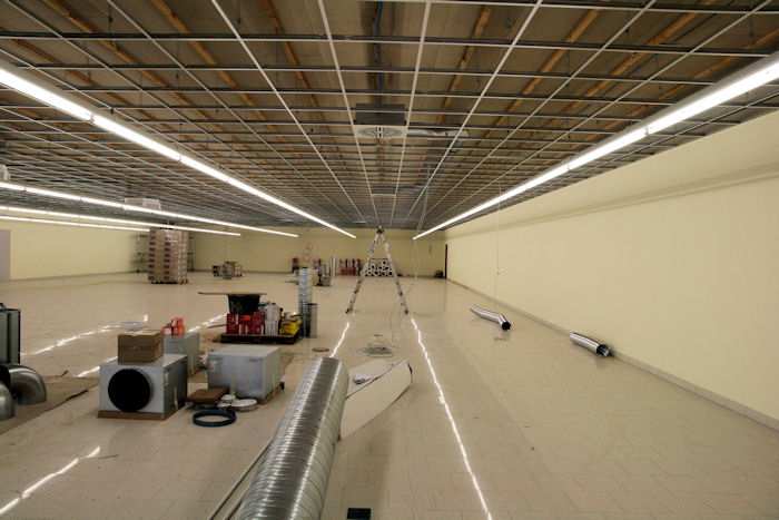 | 05.11.2010 - 13:33 Uhr - Kappeln/Schlei: Wassermühlenstraße / Ziegeleiweg Neubau eines Penny Marktgebäudes Verkaufsbereich In das Gerüst der abgehängten Decke werden die Deckenplatten eingelegt. Ostseite - Blick von Norden in Richtung Süden. Foto: Eckhard Schmidt - Kappeln - (C) 2010 |