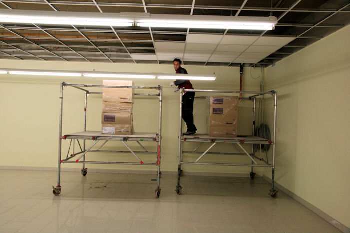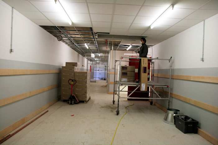| 05.11.2010 - 13:41 Uhr - Kappeln/Schlei: Wassermühlenstraße / Ziegeleiweg Neubau eines Penny Marktgebäudes Personalbereich - Bild: Aufenthaltsraum Auch hier wurden in allen Räumen die Deckenplatten in das Gerüst der abgehängten Decke eingesetzt. Foto: Eckhard Schmidt - Kappeln - (C) 2010 |