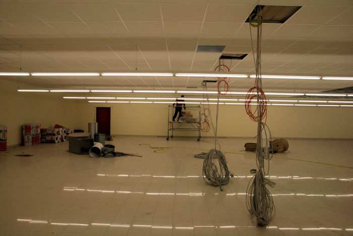 | 05.11.2010 - 13:33 Uhr - Kappeln/Schlei: Wassermühlenstraße / Ziegeleiweg Neubau eines Penny Marktgebäudes Verkaufsbereich In das Gerüst der abgehängten Decke werden die Deckenplatten eingelegt. Blick von der Mitte in Richtung Osten. Foto: Eckhard Schmidt - Kappeln - (C) 2010 |
