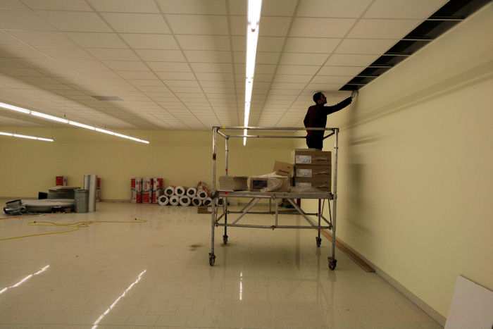 | 05.11.2010 - 13:31 Uhr - Kappeln/Schlei: Wassermühlenstraße / Ziegeleiweg Neubau eines Penny Marktgebäudes Verkaufsbereich In das Gerüst der abgehängten Decke werden die Deckenplatten eingelegt. Nordseite Foto: Eckhard Schmidt - Kappeln - (C) 2010 |