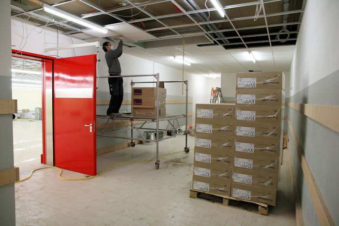| 05.11.2010 - 13:39 Uhr - Kappeln/Schlei: Wassermühlenstraße / Ziegeleiweg Neubau eines Penny Marktgebäudes Nordseite - abgeteilter Bereich Auch hier werden die Deckenplatten in das Gerüst der abgehängten Decke eingesetzt. Vordergrund: Öffnung in der Decke mit einer Bodentreppe. Foto: Eckhard Schmidt - Kappeln - (C) 2010 |