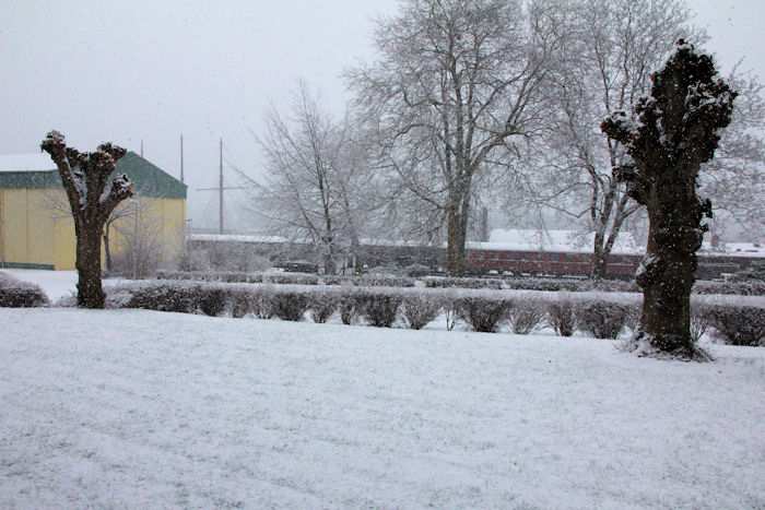 | 13.12.2010 - 11:33 Uhr - Kappeln/Schlei: Bahnhofsweg Leise rieselt der Schnee Blick von meiner Terrasse in Richtung Loitmark / GAG-Silo. Foto: Eckhard Schmidt - Kappeln - (C) 2010 |