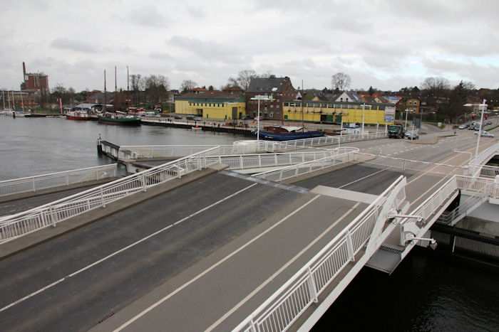 | 13.04.2011 - 8:46:25 Uhr - Kappeln/Schlei: Schleibrücke Brückenöffnung 8:45 Uhr mit HAITHABU und MERETE CHRIS Brückenwärter Oliver Warncke hat per Mausklick den Befehl zum Öffnen der Brückenklappen erteilt. Foto: Eckhard Schmidt - Kappeln - (C) 2011 |