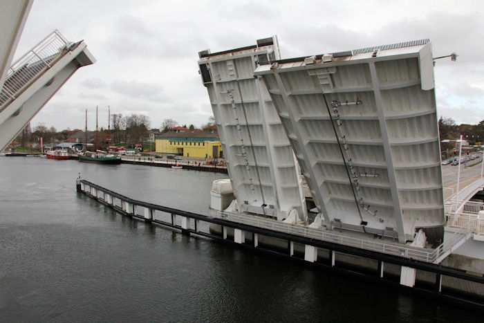 | 13.04.2011 - 8:47:21 Uhr - Kappeln/Schlei: Schleibrücke Brückenöffnung 8:45 Uhr mit HAITHABU und MERETE CHRIS Die Klappen haben noch nicht die Stellung Hochlage erreicht. Foto: Eckhard Schmidt - Kappeln - (C) 2011 |