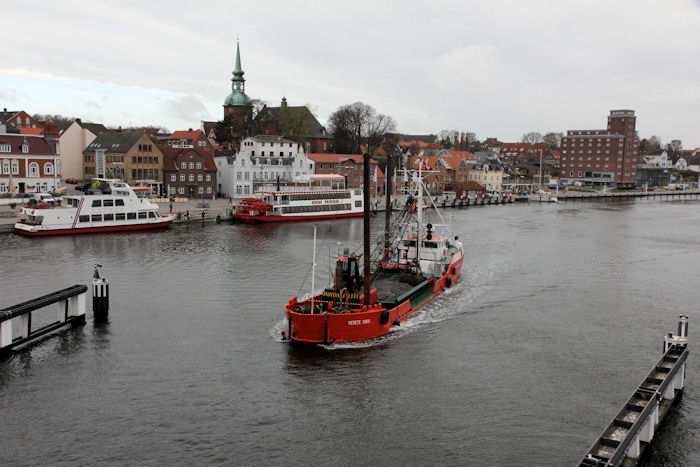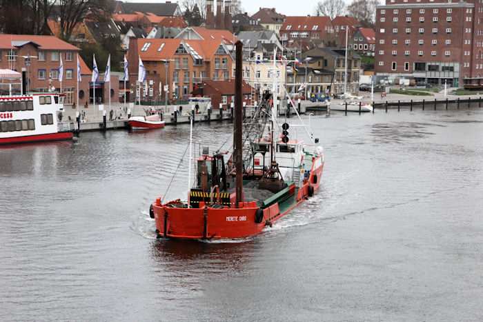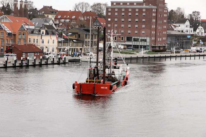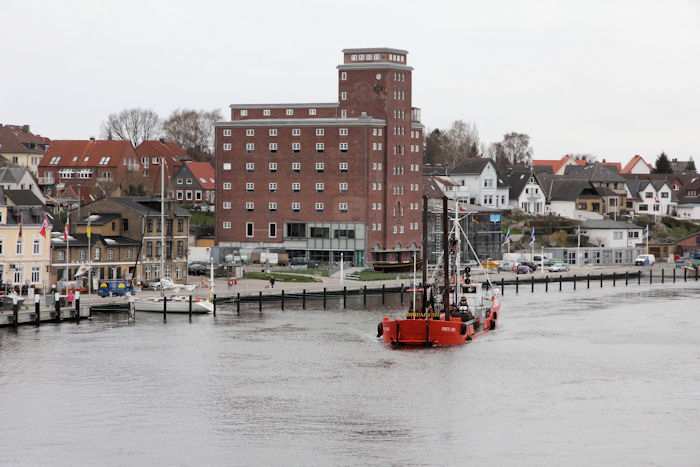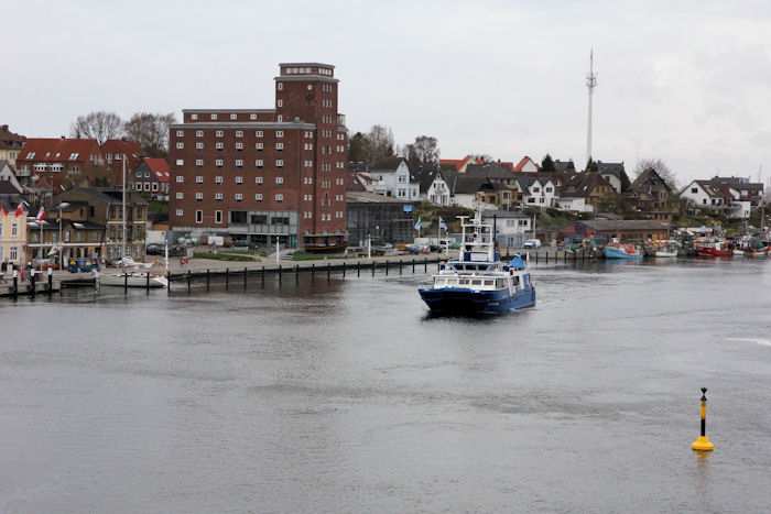 | 13.04.2011 - 8:50:37 Uhr - Kappeln/Schlei: Schleibrücke Brückenöffnung 8:45 Uhr mit HAITHABU und MERETE CHRIS Zügig nähert sich die MERETE CHRIS der Schleibrücke. Foto: Eckhard Schmidt - Kappeln - (C) 2011 |