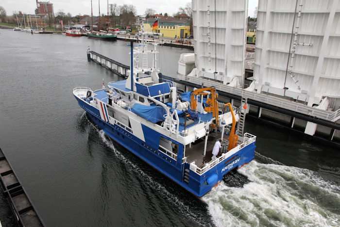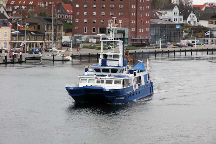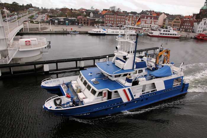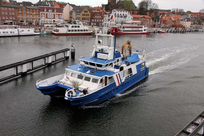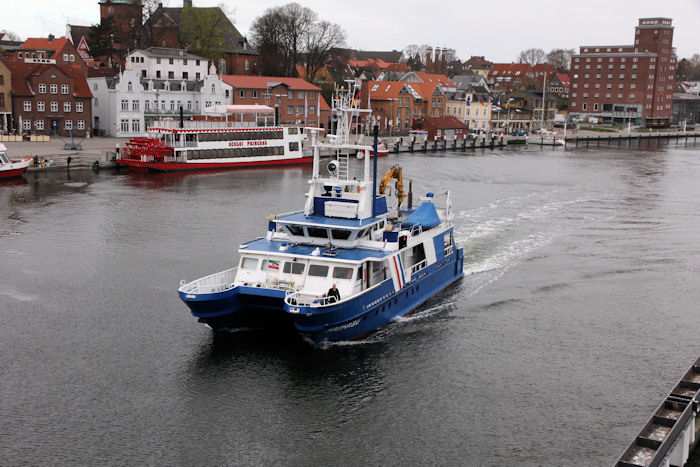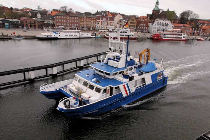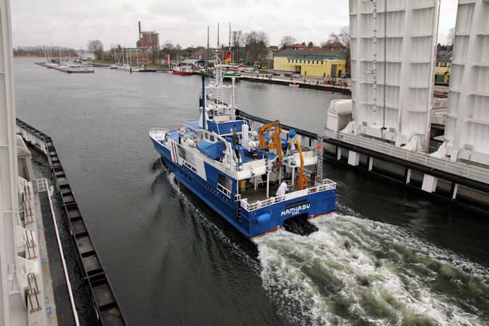 | 13.04.2011 - 8:48:03 Uhr - Kappeln/Schlei: Schleibrücke Brückenöffnung 8:45 Uhr mit HAITHABU und MERETE CHRIS Die Klappen haben die Stellung Hochlage erreicht. Langsam setzt sich das Umweltmessschiff HAITHABU in Bewegung. Info zur HAITHABU Foto: Eckhard Schmidt - Kappeln - (C) 2011 |