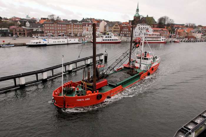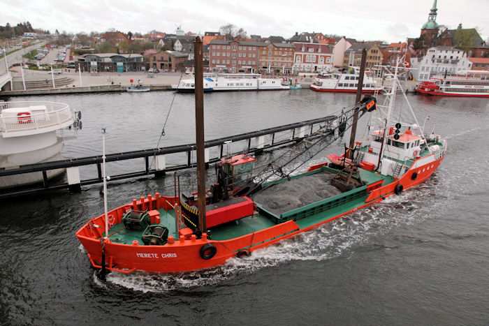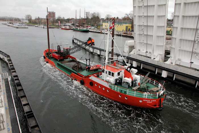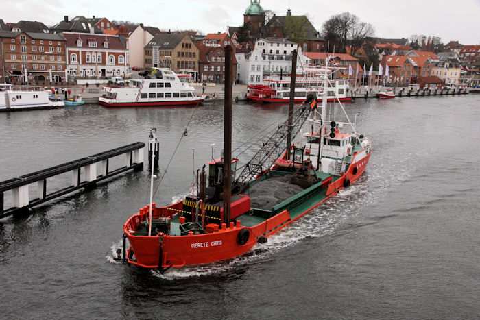 | 13.04.2011 - 8:50:17 Uhr - Kappeln/Schlei: Schleibrücke Brückenöffnung 8:45 Uhr mit HAITHABU und MERETE CHRIS Die MERETE CHRIS hat zwischen dem Tonnenpaar "3/4" und "5/6" Baggerarbeiten ausgeführt und ist jetzt mit dem Baggergut (Seesand) auf dem Weg in Richtung Schleswig. Foto: Eckhard Schmidt - Kappeln - (C) 2011 |