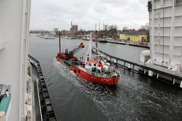 | 13.04.2011 - 8:48:43 Uhr - Kappeln/Schlei: Schleibrücke Brückenöffnung 8:45 Uhr mit HAITHABU und MERETE CHRIS Die HAITHABU in der nördlichen Einfahrt des Brückenleitwerkes. Foto: Eckhard Schmidt - Kappeln - (C) 2011 |