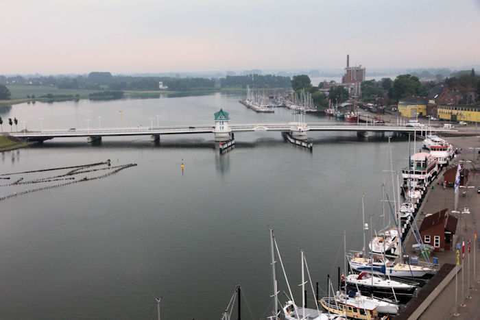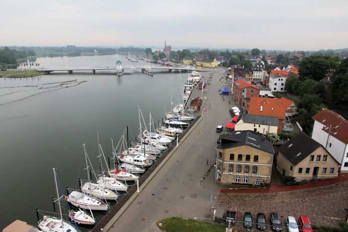 | 16.06.2011 - 8:00 Uhr - Kappeln/Schlei: PK-Speicher im Nordhafen 10. Obergeschoss - Südseite - Aussicht Schleibrücke Foto: Eckhard Schmidt - Kappeln - (C) 2011 |