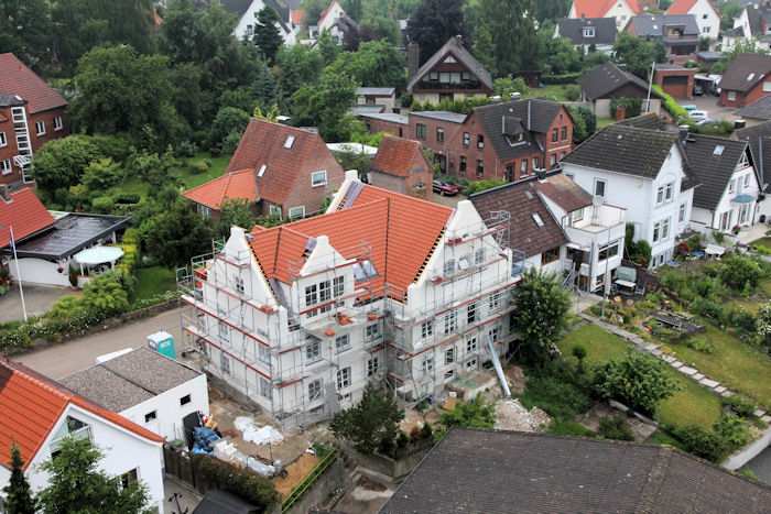 | 16.06.2011 - 8:02 Uhr - Kappeln/Schlei: PK-Speicher im Nordhafen 10. Obergeschoss - Nordseite - Aussicht Das Wohnhaus Lusthof 5 wird gerade umgebaut. An der Südseite entsteht ein neuer Anbau. Foto: Eckhard Schmidt - Kappeln - (C) 2011 |