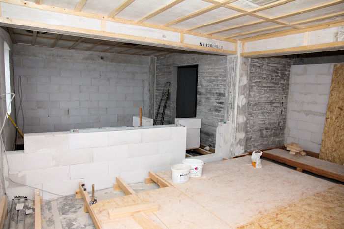 | 16.06.2011 - 8:05 Uhr - Kappeln/Schlei: PK-Speicher im Nordhafen 4. Obergeschoss - Süd- und Ostseite - Zimmer Südost Es wird gerade eine Trennwand zur Zelle 5 hin aufgemauert. Wie im 1. OG entsteht aus dem Zimmer zwei Zimmer mit Verbindungstür. Foto: Eckhard Schmidt - Kappeln - (C) 2011 |