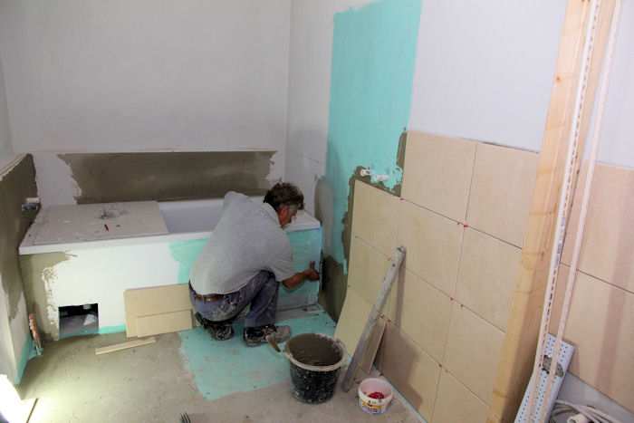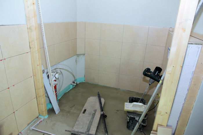 | 16.06.2011 - 8:10 Uhr - Kappeln/Schlei: PK-Speicher im Nordhafen 3. Obergeschoss - Süd- und Ostseite Zimmer Südost Südliche Hälfte der Zelle 5 -> Badezimmer Karl-Wilhelm Lemke von der Baufirma Bartelsen und Villbrandt ist gerade dabei das Badezimmer zu fliesen. Foto: Eckhard Schmidt - Kappeln - (C) 2011 |