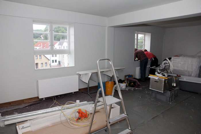 | 16.06.2011 - 8:06 Uhr - Kappeln/Schlei: PK-Speicher im Nordhafen 4. Obergeschoss - Süd- und Ostseite - Zimmer Südost Es wird gerade eine Trennwand zur Zelle 5 hin aufgemauert. Foto: Eckhard Schmidt - Kappeln - (C) 2011 |
