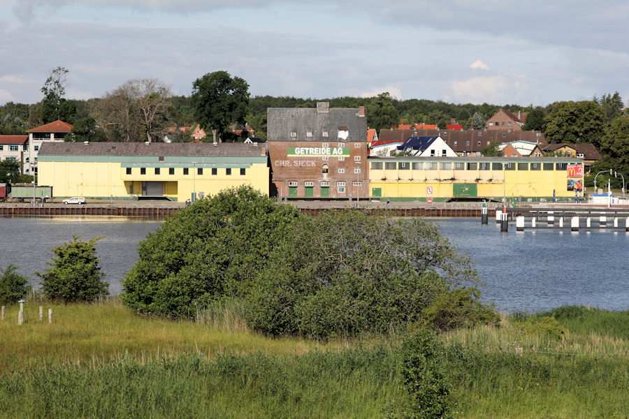 | 25.06.2011 - 8:35 Uhr - Kappeln/Schlei Hafenansichten von der anderen Seite der Schlei - Teil 2/2 Südhafen mit dem CHR. SIECK-Silo Foto: Eckhard Schmidt - Kappeln - (C) 2011 |