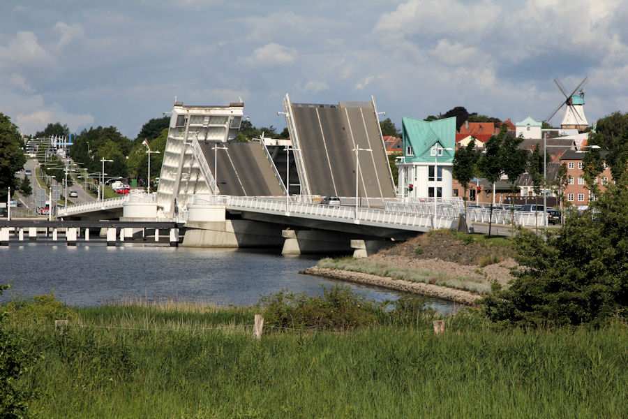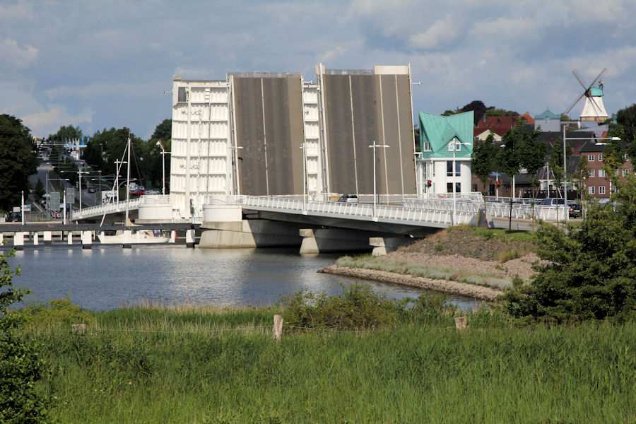 | 25.06.2011 - 8:50 Uhr - Kappeln/Schlei Hafenansichten von der anderen Seite der Schlei - Teil 2/2 Schleibrücke - Mühle Amanda Brückenöffnung 8:45 Uhr Die Klappen befinden sich in der Stellung Hochlage und die Sportboote können die Brücke passieren. Foto: Eckhard Schmidt - Kappeln - (C) 2011 |