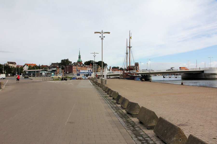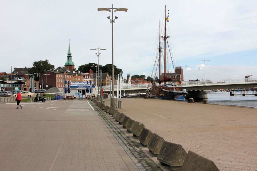 | 10.08.2011 - 8:46 Uhr - Kappeln/Schlei: Südhafen Heute: Südhafen mit der Brückenauffahrt für die neue Klappbrücke Die Kaimauer befand sich früher bei den Betonklötzen. Die neue Kaimauer rechts wurde etwa 1978 gebaut. Peter Kruse hat später neben seinem 1. Speicher noch zwei Gebäude errichten lassen. 1. In Richtung Norden: Ein Kontorhaus (noch vor dem 1. Weltkrieg) 2. In Richtung Süden: Ein Speichergebäude (noch vor dem 2. Weltkrieg - etwa 1939) Die Ponton- und Drehbrücke befanden sich in Höhe des Fährbergs. Die Klappbrücke wurde weiter südlich in Höhe der Hospitalstraße errichtet. Auf dem Gelände des Elektrizitätswerkes von Martin Klencke wurde 1935/1936 der PK-Speicher errichtet. Südhafen <--- Klappbrücke ---> Nordhafen Foto: Eckhard Schmidt - Kappeln - (C) 2011 |