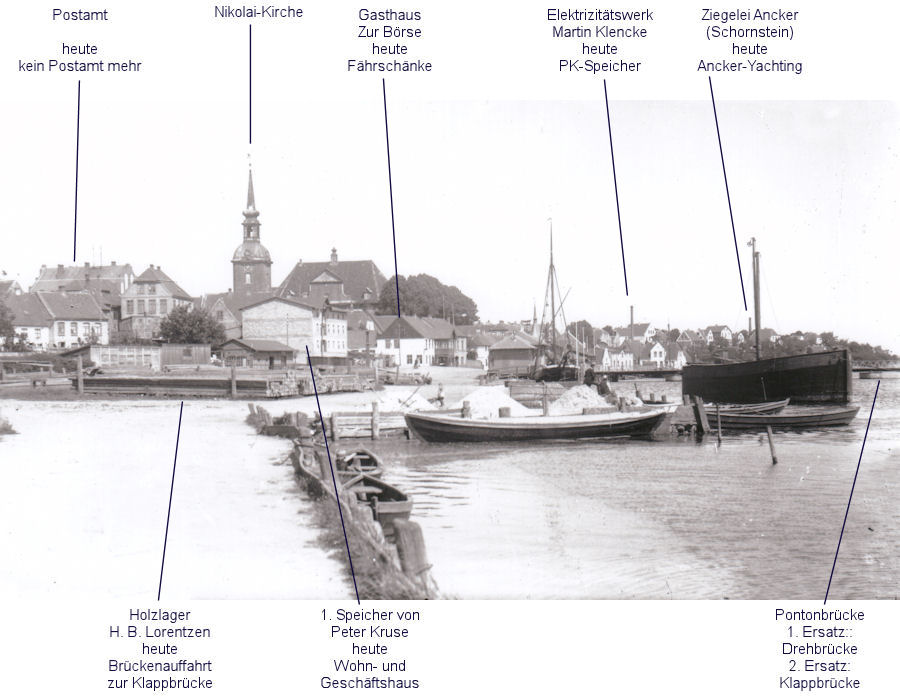| Kappeln/Schlei: Südhafen - Aufnahmedatum um 1900 Früher: Südhafen mit dem Holzlager der Holzhandlung H. B. Lorentzen Von der Holzhandlung H. B. Lorentzen befand sich damals die Kaimauer in Richtung Süden weiter landeinwärts. Die Holzhandlung H. B. Lorentzen gibt es heute nicht mehr. Das Gasthaus Zur Börse" wurde 1940 durch eine Fliegerbombe zerstört. Auf dem freien Eckgelände wurde 1961 ein Neubau errichtet. In dem Gebäude befindet sich heute die Fährschänke". Südhafen <--- Pontonbrücke ---> Nordhafen Foto: Archiv der Stadt Kappeln |