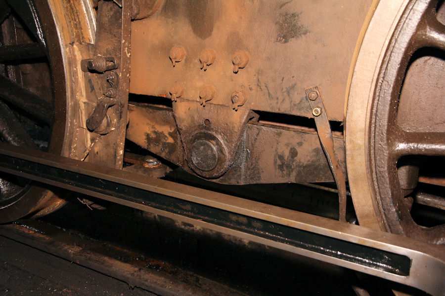 | 08.09.2011 - 13:31 Uhr - Kappeln/Schlei: Angelner Dampfeisenbahn Dampflok Julchen" - alle Federpakete eingebaut Rechte Seite hinteres Federpaket Um den vorderen Stehbolzen von unten her einbauen zu können, musste die Schwinge komplett ausgebaut werden. Foto: Eckhard Schmidt - Kappeln - (C) 2011 |